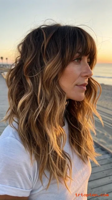 A wavy beach shag leans into natural wave patterns. The layers break up bulk and create soft swing.