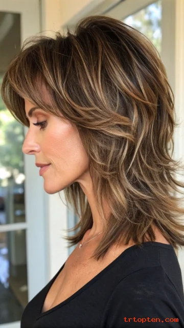 A soft romantic shag keeps layers gentle and blended. It adds movement without sharp choppiness.Ask for long, soft layers and a light face frame.