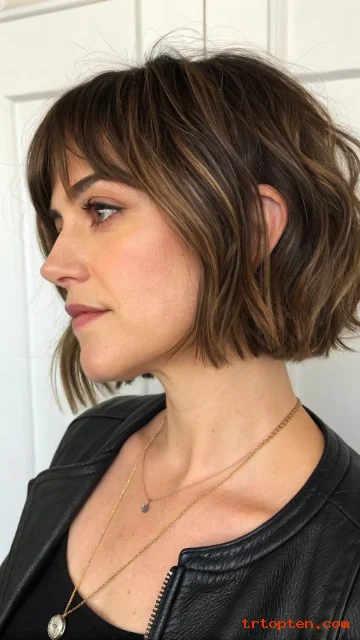 This cut suits straight to wavy hair and pairs well with darker tones. Keep layers trimmed so they stay punchy.