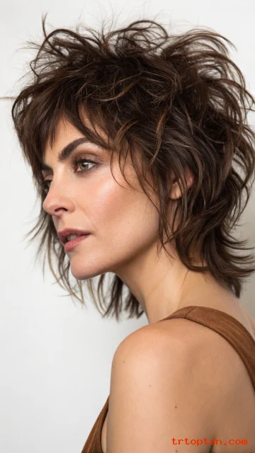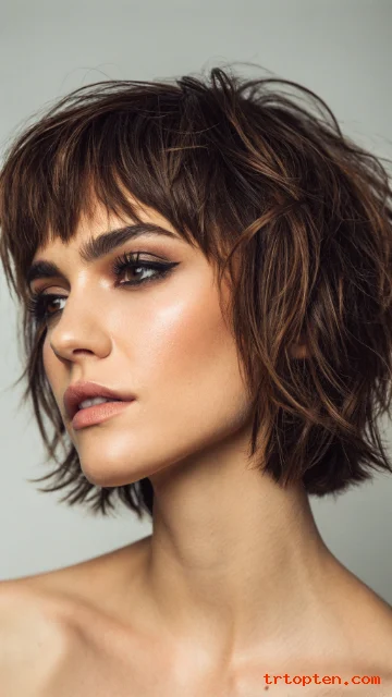 A short classic shag keeps the crown light and the ends choppy for fast volume. It works well if you want a low-fuss cut that still looks styled.