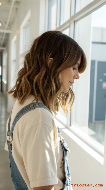 Ask for a lob base with shaggy internal layers and subtle face framing. Use a curling wand in alternating directions, then brush out lightly.
