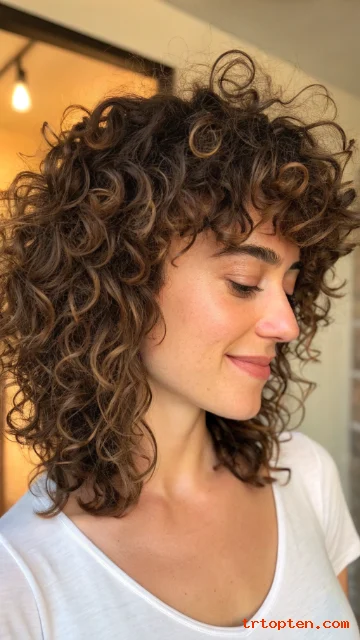 A curly shag with rounded layers shapes curls without making a triangle. It keeps bounce at the crown and space around the cheeks.