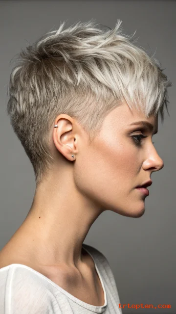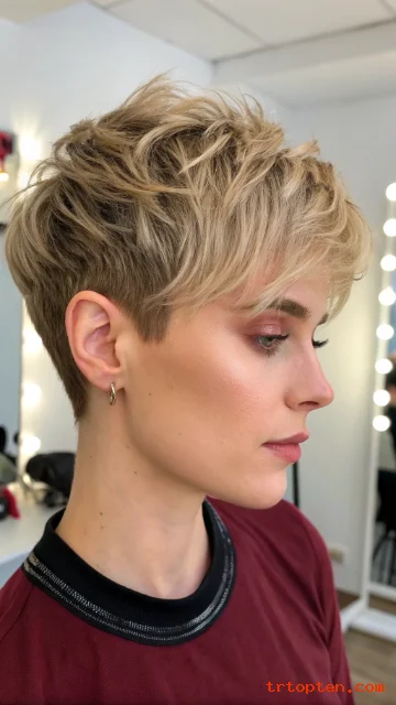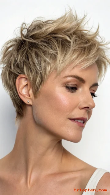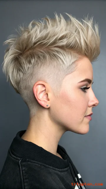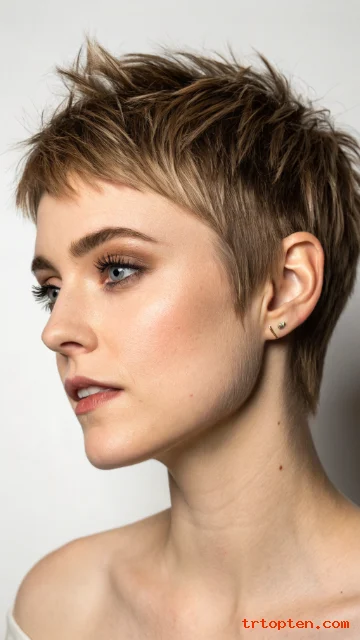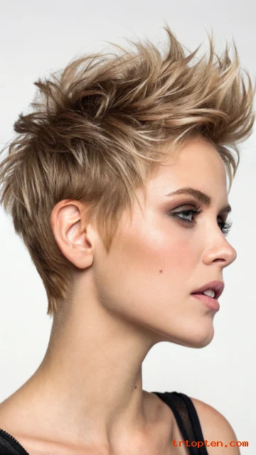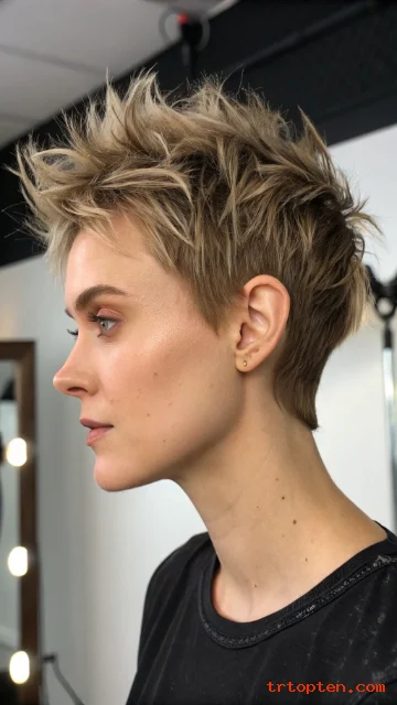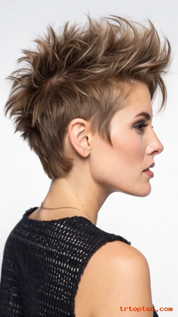 A soft mohawk pixie keeps height through the center. The sides stay shorter but not shaved. The shag texture keeps it wearable and not too harsh.