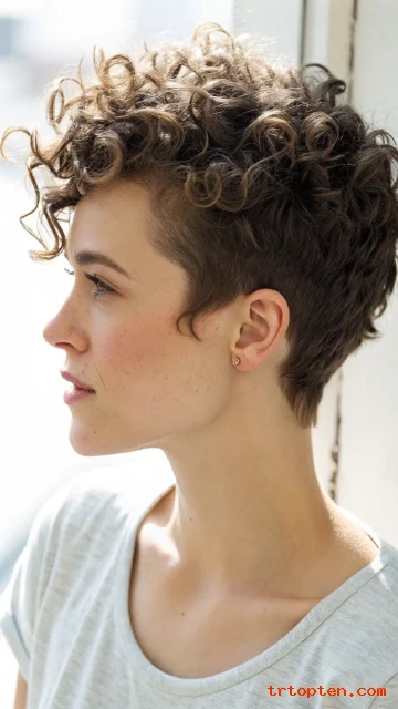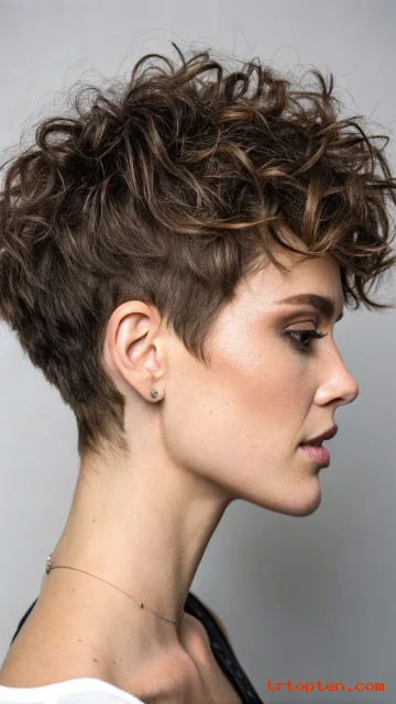 This pixie celebrates curls and keeps the shape light. The sides stay shorter to frame the face. The curly top gives height and a playful finish.