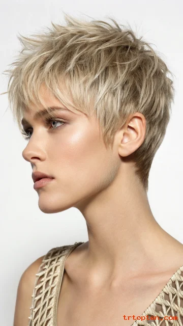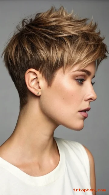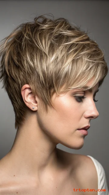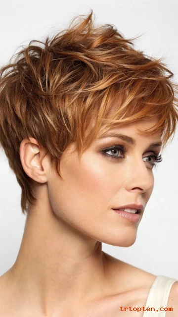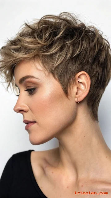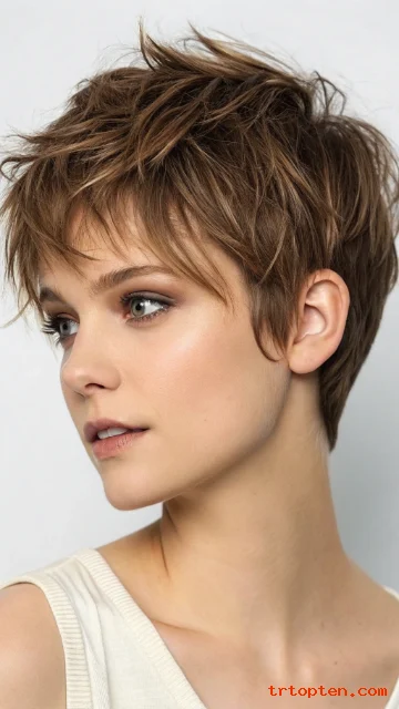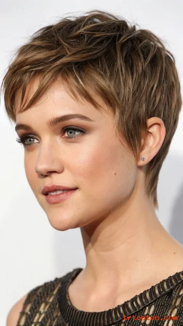 This shaggy pixie keeps the sides neat and adds choppy layers on top. The crown gets lift, so your head shape looks balanced. You can style it fast with a light paste and your fingers.