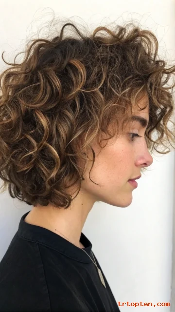 A short curly shag sits above the shoulders with lots of layered texture. It boosts volume at the top and keeps ends light and swingy.