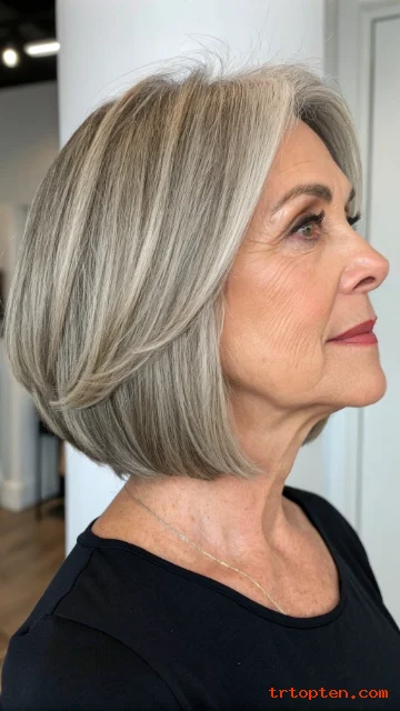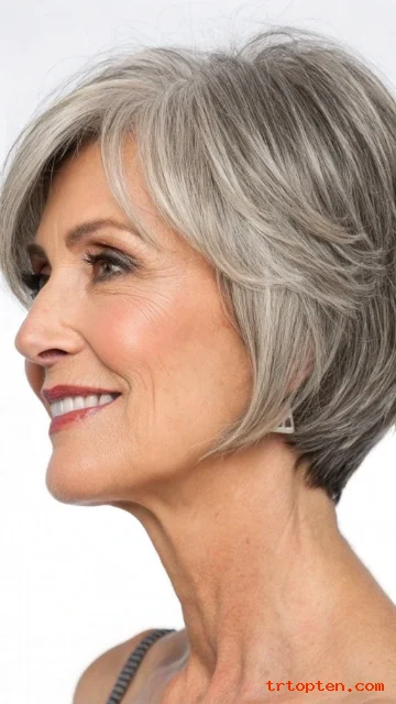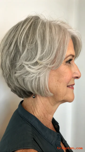 This style helps add volume for thinning hair. It also lets you change the look from smooth to piecey. It looks great with silver hair and brightening highlights.