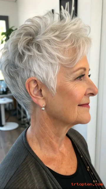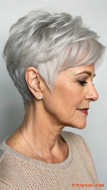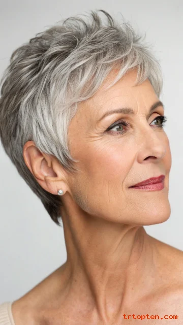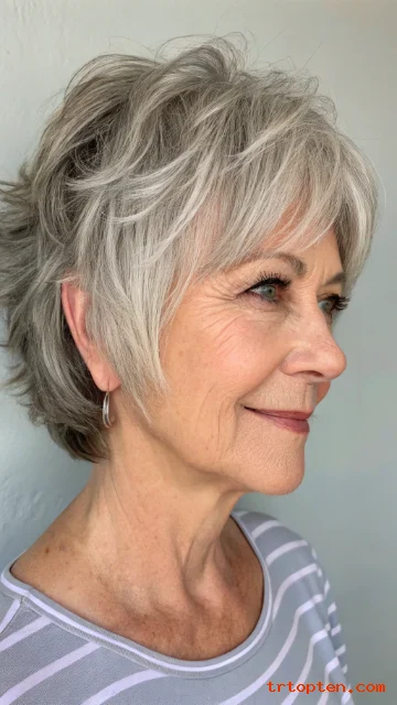 A salt-and-pepper pixie looks rich with soft highlights. Highlights add dimension and make layers stand out. The pixie shape keeps it modern and easy.