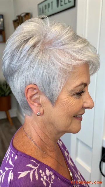 A gray blending crop helps your natural tones look smooth and intentional. The short length shows dimension and shine in silver hair.