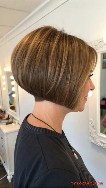 Ask for a clean angle and layered stacking behind the ears. Use a round brush to lift the back and smooth the front.