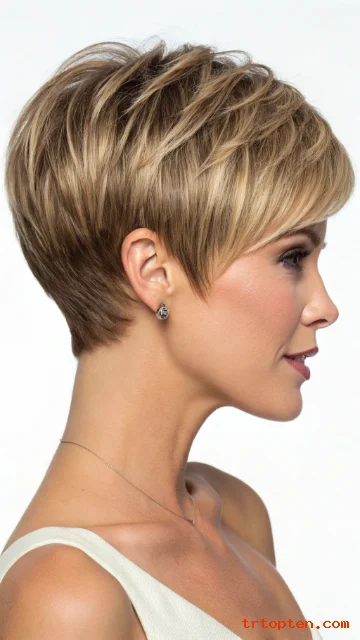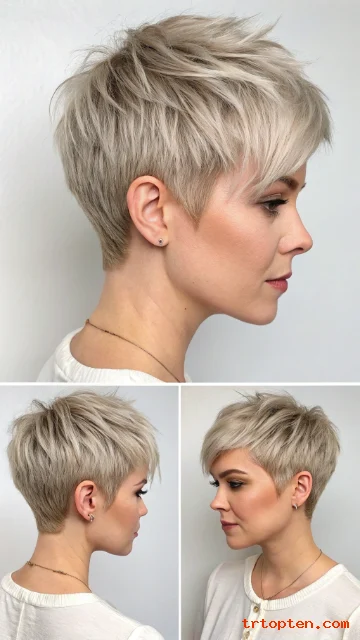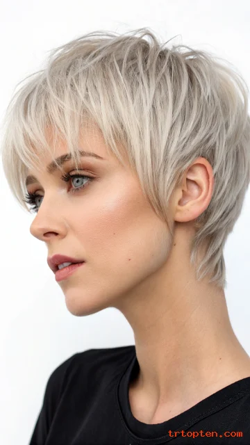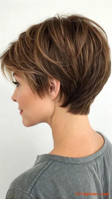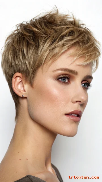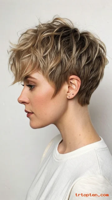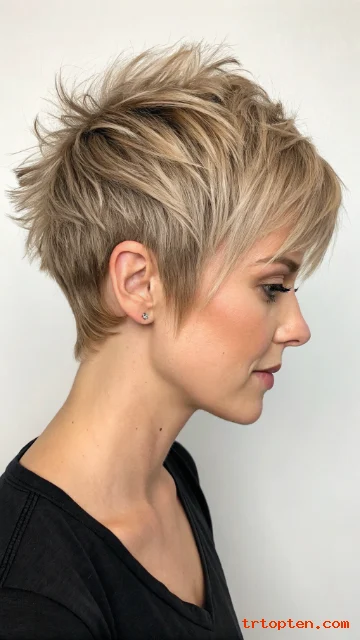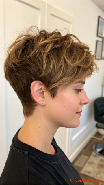 This textured pixie uses short, uneven layers to create lift on top. It keeps the sides neat so your face looks bright and open.