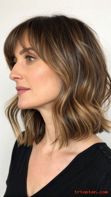 Ask for a chin-length bob with gentle layering and a wispy bang. Style with a texturizing spray for a relaxed finish.