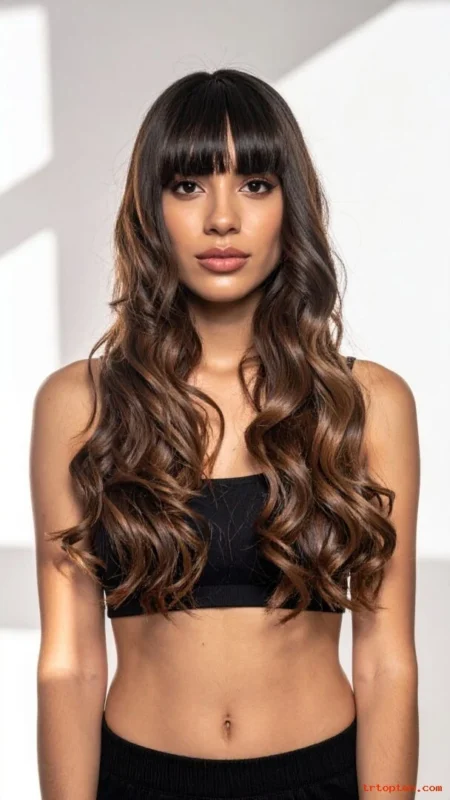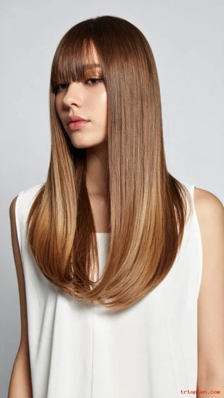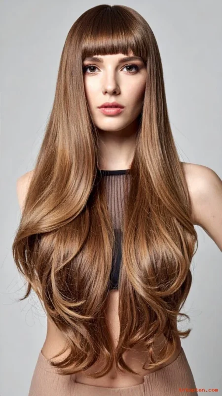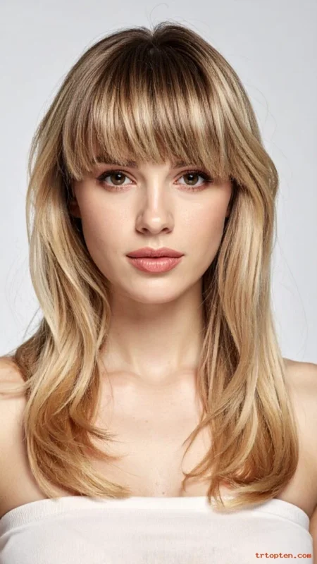 Dry the bangs with a small brush, then push them slightly apart. Use a texture spray on the layers and scrunch lightly. This cut suits round faces because it adds vertical lines. It also suits straight hair that needs movement.