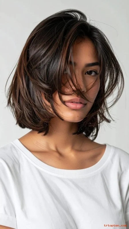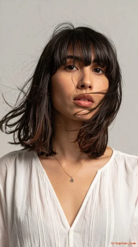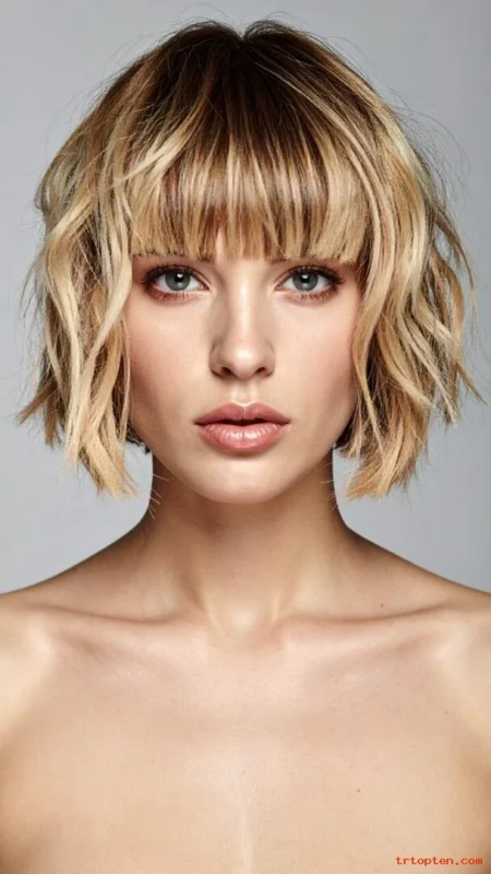 A shaggy bob with wispy bangs looks soft and playful. The bangs frame the eyes and blend into layers.