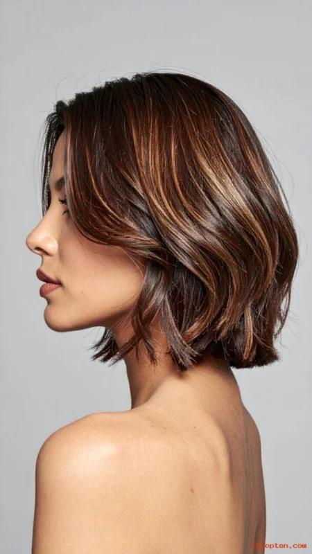 Ask for subtle face-framing highlights and blended ends. Style with loose waves and finger separation to show dimension. This look suits brunettes and blondes in the same way. It also helps your bob look fuller in photos.