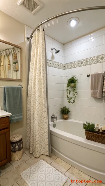 Keep the curtain long enough to stay inside the tub. Use a simple pattern for a calm look. Add matching hooks for a tidy finish.