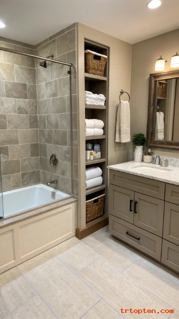 Storage near the tub reduces clutter. You can add a recessed cabinet in a nearby wall. You can also use a slim tower beside the combo.