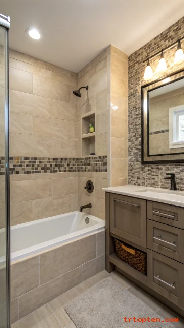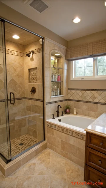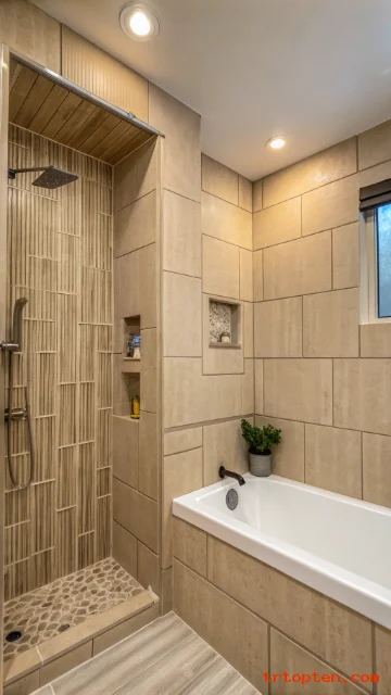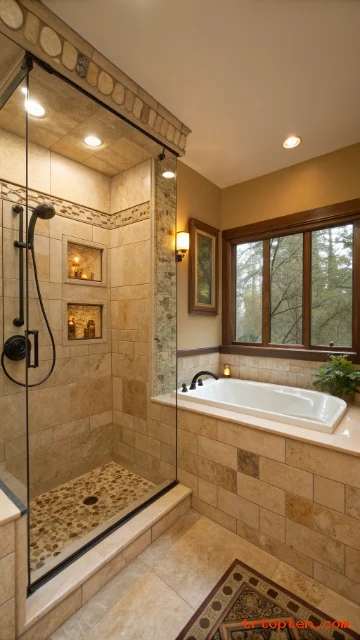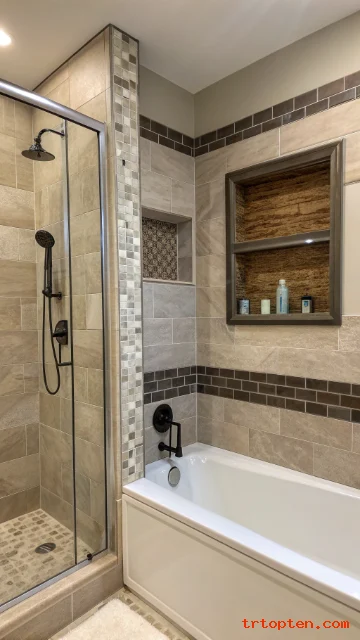 Add a slim shelf niche for shampoo bottles. Use a rain shower head if your water pressure supports it. Keep accessories minimal to let the tile shine.