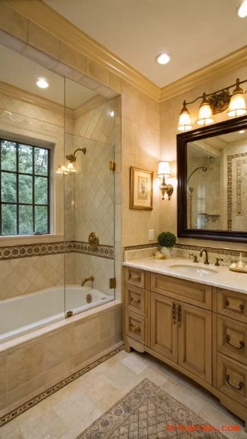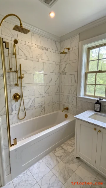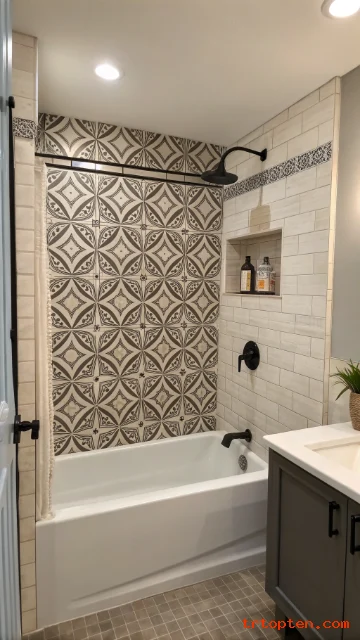 Add brass or polished nickel fixtures for shine. Keep the tub simple so the tile stands out. Add a small plant for a fresh accent.