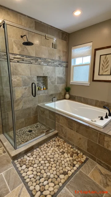 Texture helps reduce slips in wet areas. Pebble-style mosaics add a natural spa feel. They also work well with stone-look walls.