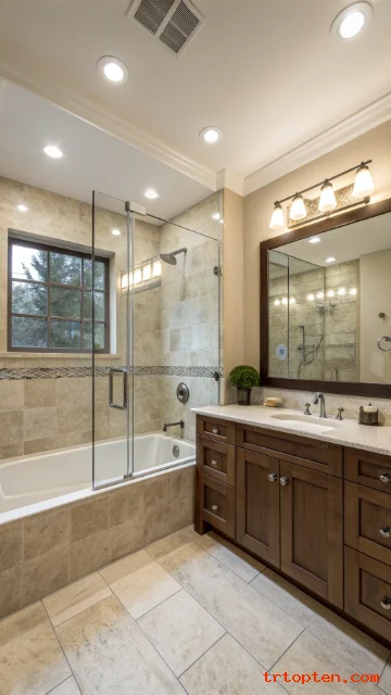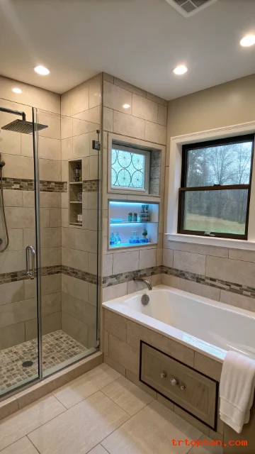 Good lighting improves safety and style. Recessed fixtures reduce shadows around the tub. They also make tile colors look true.