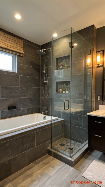 Dark tile creates a bold, hotel-like vibe. It makes fixtures pop and feels modern. Use good lighting so the room stays inviting.