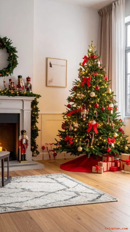 Use nutcracker ornaments, red ribbon, and gold accents for a playful theme. Add striped picks to match the look.