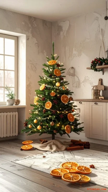 Use dried orange slices, cinnamon sticks, and natural twine garland. Add warm lights to bring out the earthy colors.