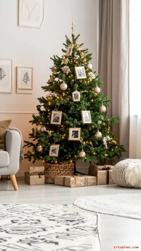 Use small photo ornaments to turn the tree into a memory display. Add neutral ornaments so the photos stand out.