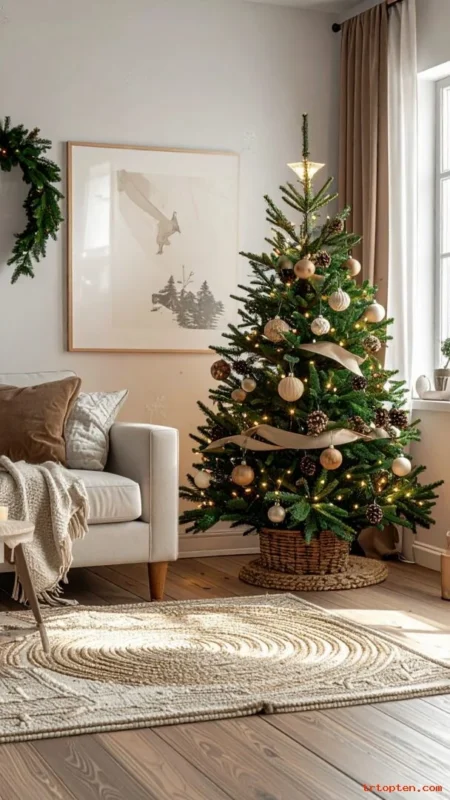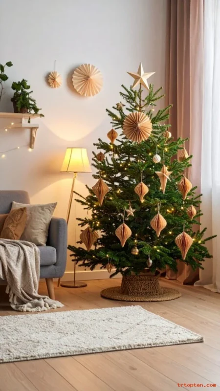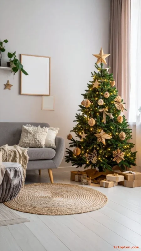 Use straw ornaments, white paper stars, and neutral ribbons for a Nordic look. Keep the design light and airy.