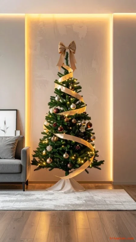 Use wide ribbon as the main decoration and skip most ornaments. This style looks neat and works well on a slim silhouette.