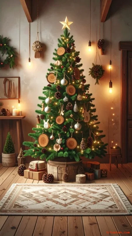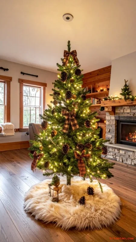 Use plaid ribbon, pinecones, and wood ornaments for a cabin feel. Add warm lights to keep it cozy.
