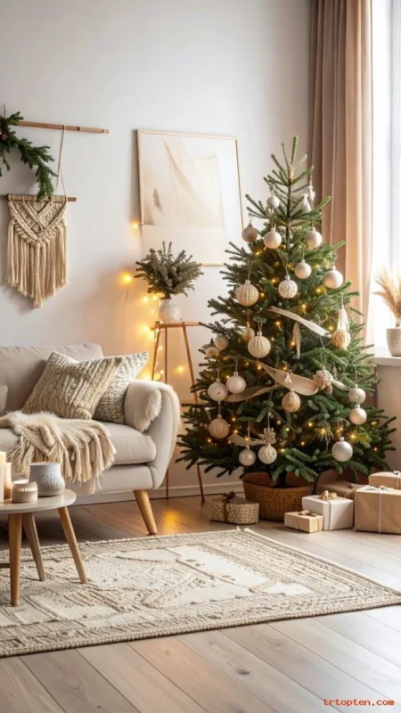 Use neutral ornaments, pampas picks, and textured ribbon for a boho style. Add soft lights to keep it warm.