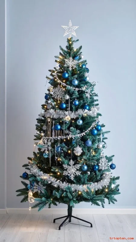 Use icy blue ornaments with silver garland for a cool, polished look. Add glitter snowflakes for sparkle.