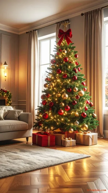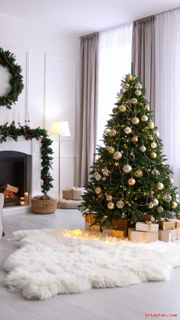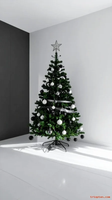 Use black, white, and silver ornaments for a clean modern look. Choose a simple star topper to keep the style sharp.