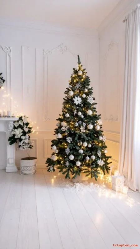 Use white ornaments, frosted picks, and icy silver accents for a snow-kissed look. Add cool white lights for an icy sparkle.