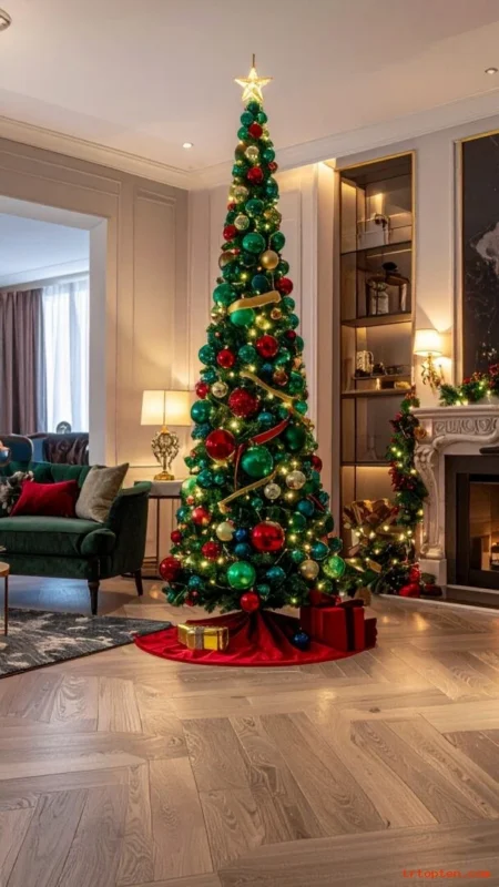Use red berries, deep green garland, and classic ornaments for a fresh look. Add warm lights to keep it inviting.