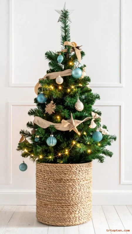 Use sea glass blue ornaments, sand-colored ribbon, and shell accents. Keep lights warm so the tree feels cozy, not cold.