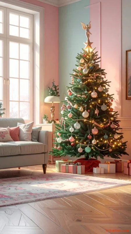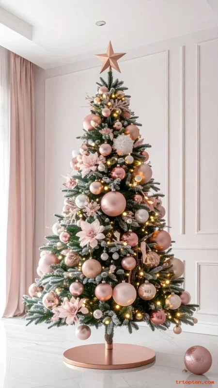 Use blush pink, rose gold, and pearl ornaments for a soft glam style. Add warm lights to keep the pink tones flattering.
