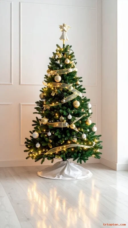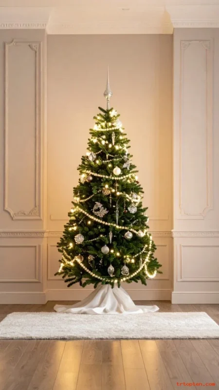 Use clear crystal ornaments and pearl garlands for a soft sparkle. This look makes a skinny tree feel fancy without looking bulky.