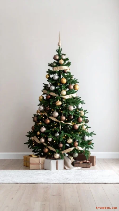 Use silver, gold, and bronze ornaments for a rich look. Keep ribbon neutral so the metals can shine.