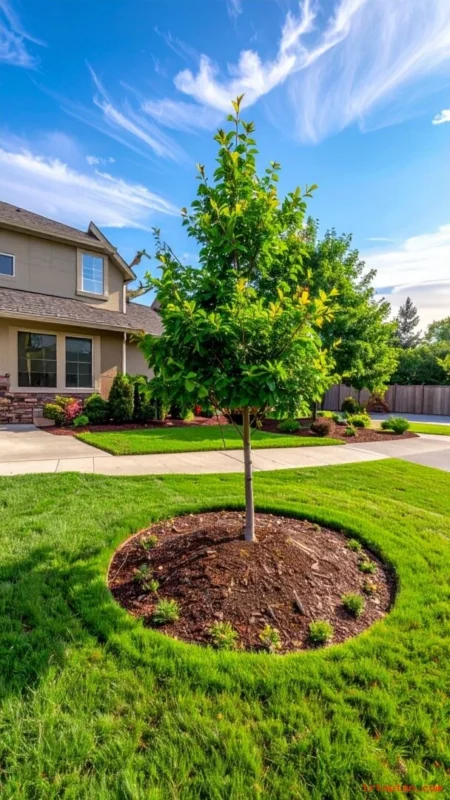 Place it slightly off-center so the yard feels natural. Underplant with shade-tolerant groundcover to keep the base tidy.