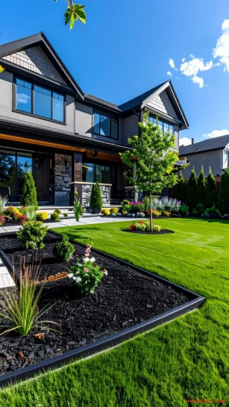 Use dark mulch for strong contrast with plants and grass. Refresh the mulch once a year so the yard always looks cared for.