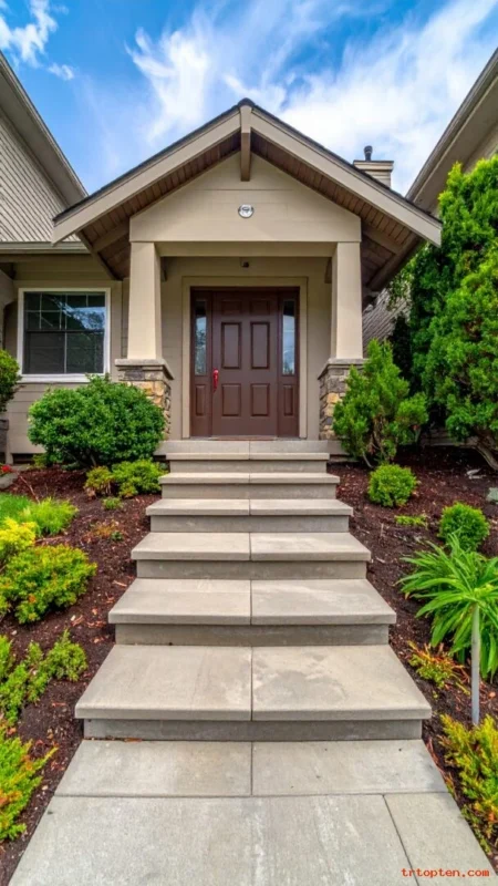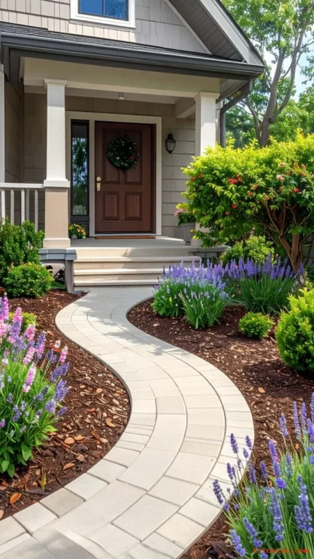 Use wide, shallow steps so the entry feels open. Plant groundcover close to the edges so it gently spills over time.