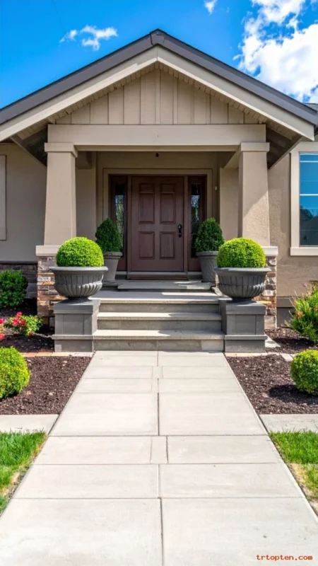 Matching pots create instant order and make the entry look high-end. Place them on both sides of the steps or front door.