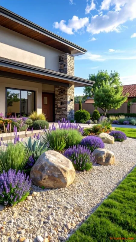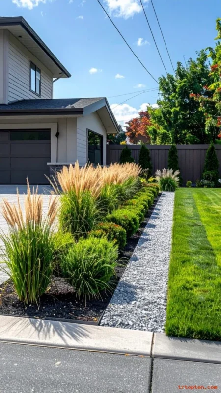 Gravel with drought-tough plants cuts watering and reduces weeds. Clean edging keeps it looking sharp.