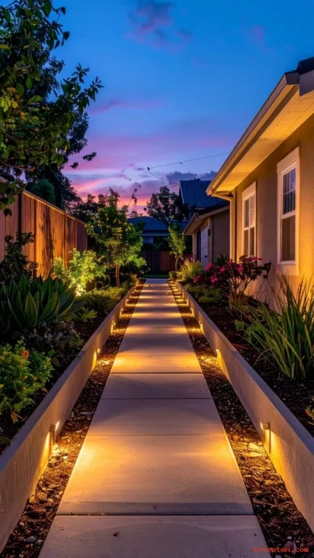 Use evenly spaced lights to guide the way. Aim lights downward so the look stays soft and not harsh.