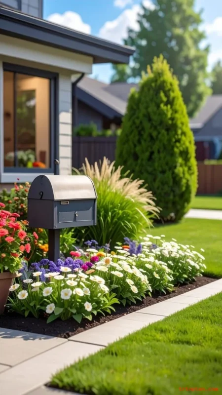 Use low plants so the mailbox stays visible. Add one taller plant behind it to create a backdrop and depth.