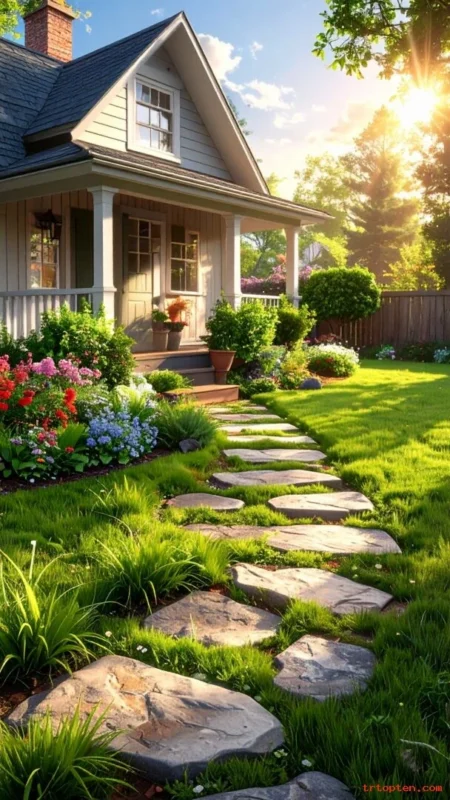 Use creeping thyme or dwarf mondo grass between stones. Keep stone spacing even so the walkway feels safe and easy to use.