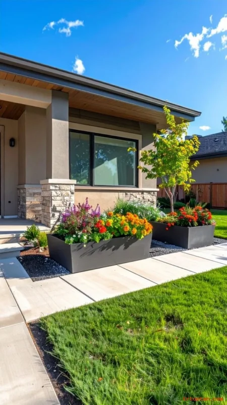 Raised planters lift flowers closer to eye level and reduce the need for wide beds. They work well near porches, windows, or mailbox areas.